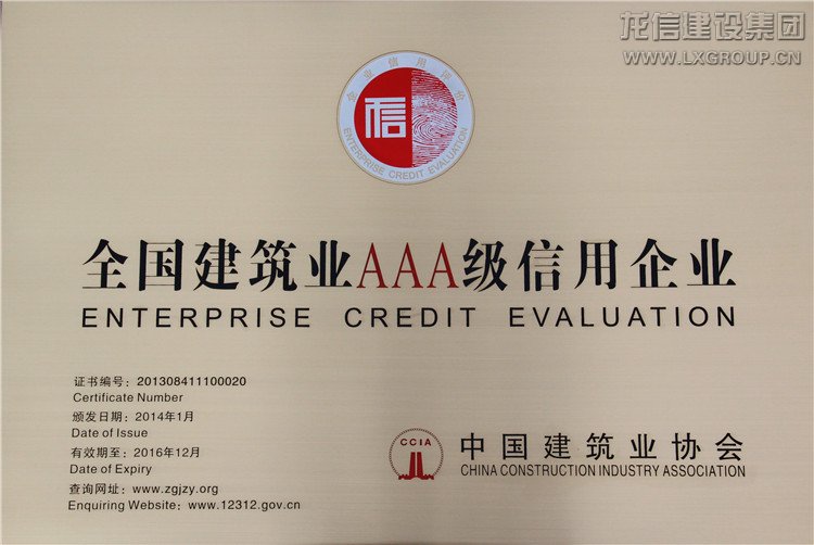 2013年獲得全國建筑業AAA級信用企業