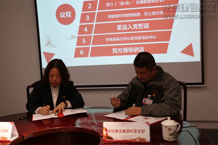 本次活動(dòng)以“融·筑+”黨建結(jié)對(duì)共建為主題,全體黨員共同重溫入黨誓詞,堅(jiān)定理想信念。龍信集團(tuán)科室支部副書記施金浩與海門農(nóng)商行機(jī)關(guān)第三黨支部書記劉曉艷共同簽訂《“融·筑+”黨建聯(lián)盟協(xié)議書》,以“黨建互促、服務(wù)互聯(lián)、專業(yè)互助、資源互享、廉政互督”為原則建立聯(lián)系、加強(qiáng)溝通,實(shí)現(xiàn)信息共享、優(yōu)勢(shì)互補(bǔ)。現(xiàn)場(chǎng)黨員們共同創(chuàng)建“融·筑+”黨建結(jié)對(duì)共建微信群,同上“微黨課”《讓信仰之光在心中閃亮》。隨后大家重溫入黨誓詞并參觀海門農(nóng)商銀行同心圓黨建活動(dòng)中心。