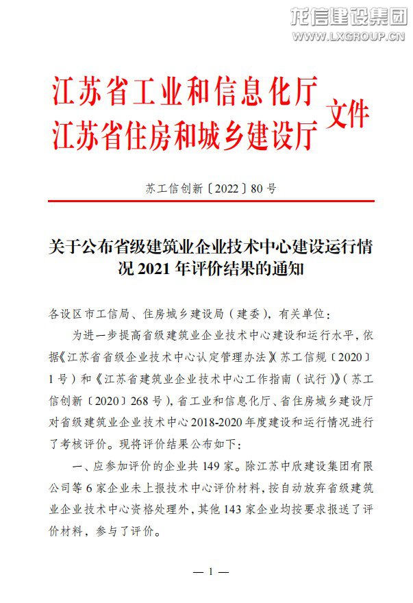 近日,江蘇省工業(yè)和信息化廳、江蘇省住房和城鄉(xiāng)建設(shè)廳印發(fā)《關(guān)于公布省級建筑業(yè)企業(yè)技術(shù)中心建設(shè)運(yùn)行情況2021年評價結(jié)果的通知》(蘇工信創(chuàng)新〔2022〕80號),龍信集團(tuán)獲2021年江蘇省建筑業(yè)企業(yè)技術(shù)中心“考核優(yōu)秀”的評定。本次共有149家企業(yè)參評,15家企業(yè)技術(shù)中心評價結(jié)果為優(yōu)秀。