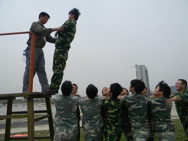 在做“高臺背摔”拓展訓練時,隊員們協(xié)同配合,親密無間,增進了對團隊的信任。